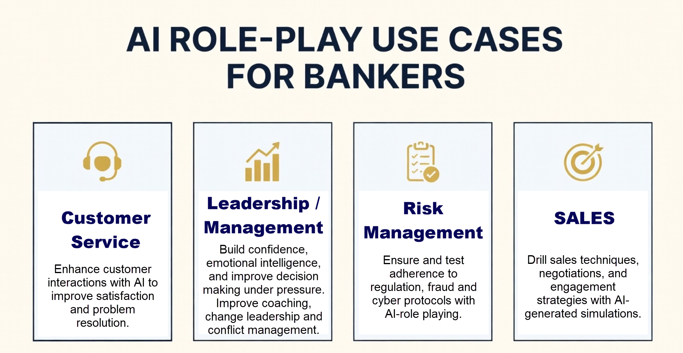 Outside of self-improvement, banks can leverage AI for scenario role play and achieve 80%+ completion rates compared to the 20% completion rates often associated with non-mandatory e-learning classes. We have found that time-to-competency can increase by some 60% compared to reading and then waiting for the right scenario to practice a new skill.