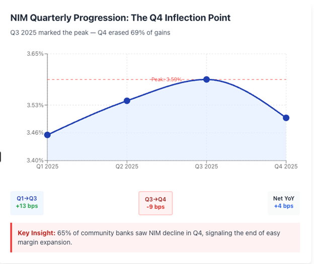 Cost of funds fell approximately 24 basis points for community banks despite three, 25 bps rate cuts in 2025 coming at the back half of the year. Due to high loan-to-deposits, lack of differentiated product, strong deposit competition and too great an adjustment lag, community banks were unable to reset their cost of funds down enough to match or exceed their asset yield.