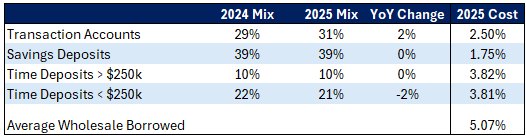 When it comes to deposit mix, banks lost about 10% of their core deposits to money market funds, fintechs, and investment alternatives. Lower rates stemmed that flow, and banks likely increased their transaction accounts by 2% over the year.