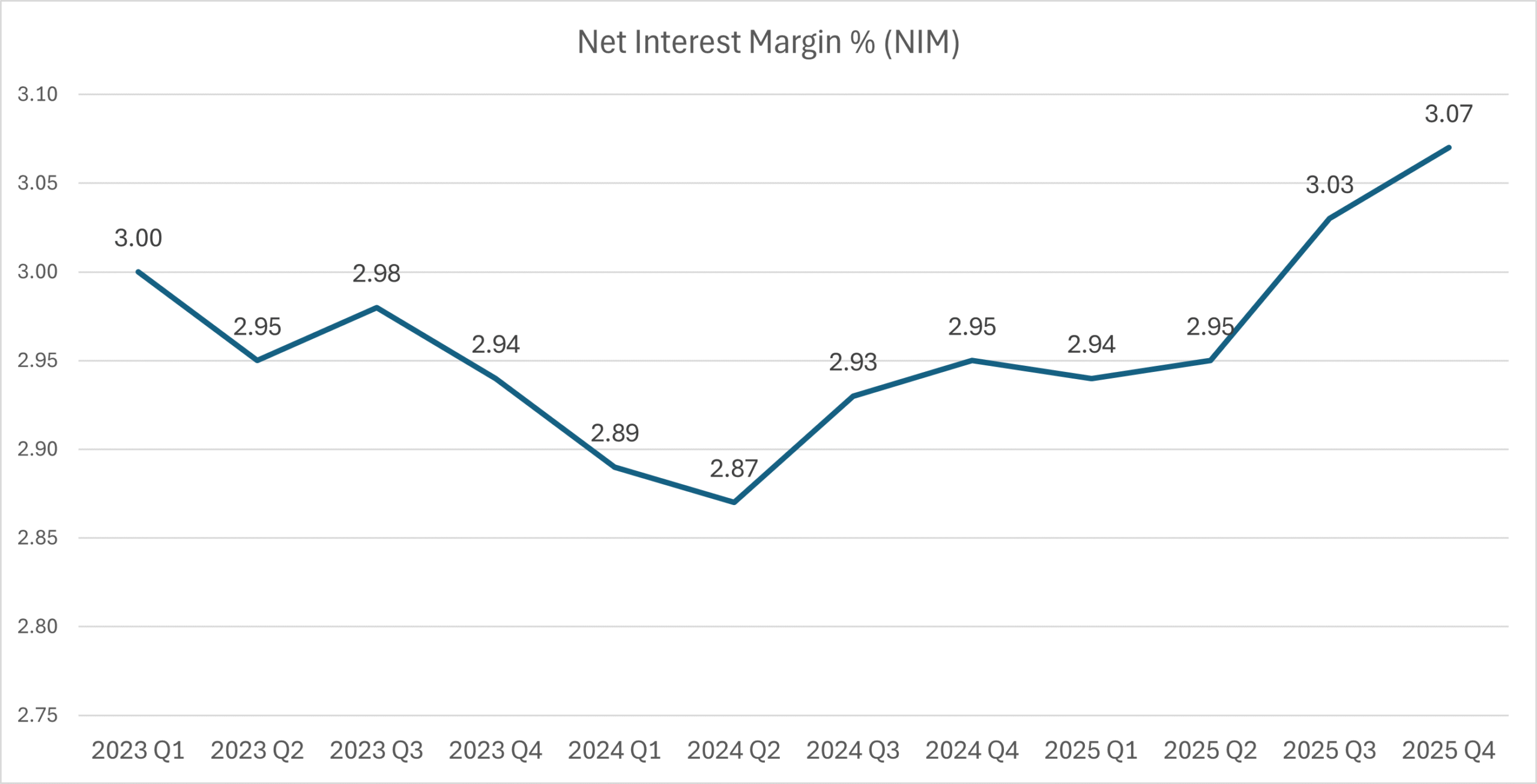 NIM improved four basis points for the quarter and 12 basis points for the year. This is against the backdrop of a 75-basis-point reduction in the Fed Funds target rate. Most banks waited for the Fed to move rates despite lower market rates since 3Q 2024.