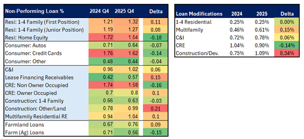 Credit quality remained about the same in 2025. Non-performing loans-to-total loans improved from 0.98% in 2024 to 0.96% at the end of 2025, non-accruing loans ticked up one basis point to 0.69%, and loans 30-69 days delinquent fell as a percent of loans from 0.63% to 0.60%. Unfortunately, little solace can be gleaned from these numbers, as looking under the hood, we see that loans past 30 days delinquent increased some 12.7% from Q3 to Q4 – a warning sign.