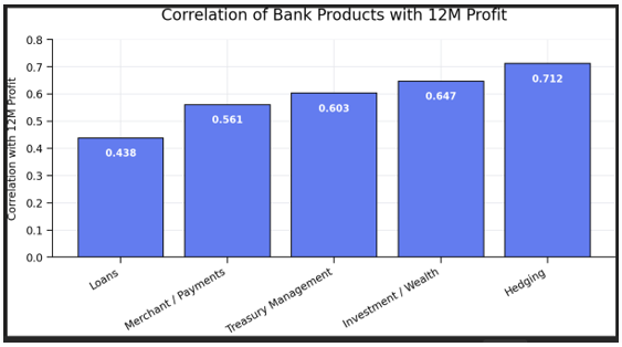 However, diversification across interest margin, fee income, and deposit spread can meaningfully increase bank profitability. The graph below shows correlation between this bank’s products and 12-month profit.