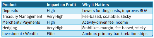 - Clients that maintain both lending and operating deposits consistently outperform loan-only or deposit-only relationships. Deposits lower funding costs and improve net interest margins even when loan spreads compress.