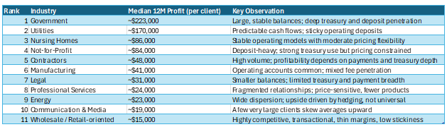 - Industry and profitability are only loosely correlated. Certain industries have different scale, credit quality, and cross-sell opportunities. Some industries with complex cash flows and entity structures show the strongest correlation between product breadth and profitability. However, that relationship is not as strong as the size of the client and number of products used by the client. Below is the industry ranking for this bank.