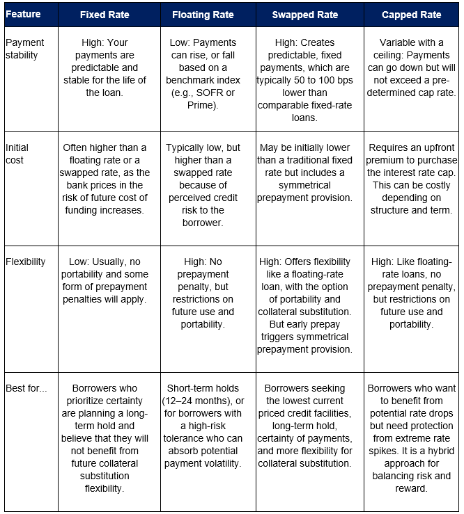 - Risk tolerance: Seasoned borrowers consider their property/portfolio and the free cash flow’s ability to accommodate rising or volatile P&I payments. More conservative borrowers or properties or projects with more volatile NOI/EBITDA will favor fixed or swapped rates, while those with higher risk tolerance may choose floating-rates.