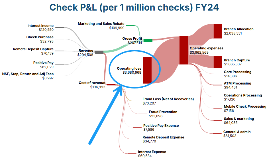For every one million checks processed, banks lose approximately $3.7 million (in the middle of the above graphic) in processing cost to include revenue, rebates, labor, equipment and facilities cost. We are in essence, subsidizing customers to promote their most costly payment channel while also subsidizing criminals with an easy vector to commit crimes.